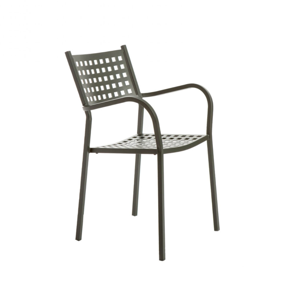 Dining chair with armrests made of weather-resistant galvanized metal. Alice is a chair with a retro design, ideal for furnishing both residential and contract outdoor spaces. Resistant and robust chair, the metal painting is carried out with Qualicoat class 1 and class 2 thermosetting polyester powders.