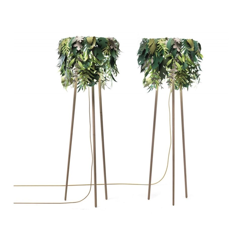 Un pezzo di giungla che illumina le nostre case. La lampada da terra Amazzonio, a luce diffusa, ha il paralume realizzato in carta plastificata e portalampada in metallo mentre la struttura portante, in steli di legno di frassino naturale. Il cavo elettrico è rivestito in tessuto colore oro (Lampadina con attacco E27 | MAX 60W esclusa).