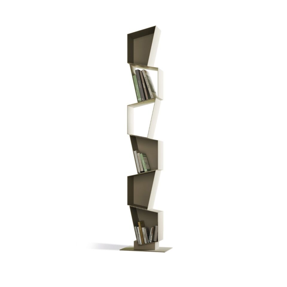 La libreria SU di Ronda Design, disegnata da Diego Collareda, Etimodesign, è un complemento d’arredo freestanding dal forte impatto estetico, perfetta per ambienti moderni ed eleganti. Realizzata interamente in metallo verniciato, si distingue per la sua struttura geometrica irregolare ispirata ai ciottoli dell’antica Via Appia, che conferisce movimento e originalità all’ambiente.